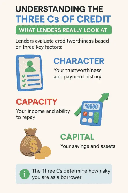 Lenders evaluate Character, Capital, and Capacity to gauge your reliability as a borrower.